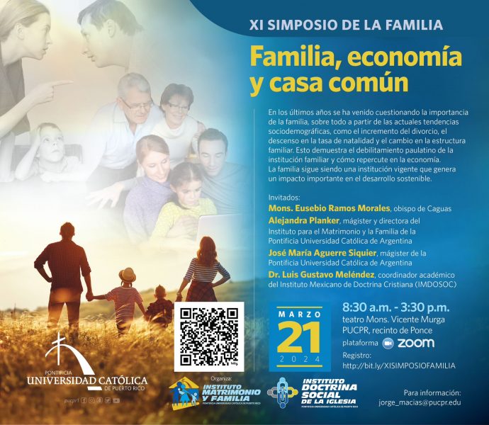 La Unidad de Relaciones Internacionales de la UCALP informa que el Instituto de Doctrina Social de la Iglesia y el Instituto de Matrimonio y Familia de la Pontificia Universidad Católica de Puerto Rico invitan al XI Simposio de la Familia que se llevará a cabo el jueves 21 de marzo de 2024 por medio de la plataforma  Zoom.