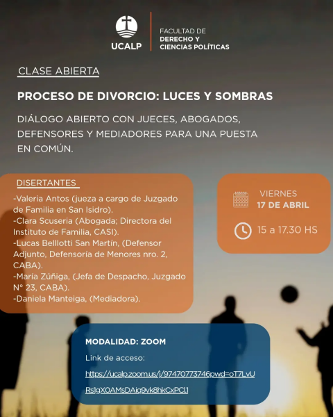 Con la presencia de jueces, abogados, defensores y mediadores, la facultad de Derecho y Ciencias Políticas llevará adelante vía Zoom la clase abierta “Proceso de divorcio. Luces y sombras”, el próximo viernes 17 de abril de 15 a 17:30.