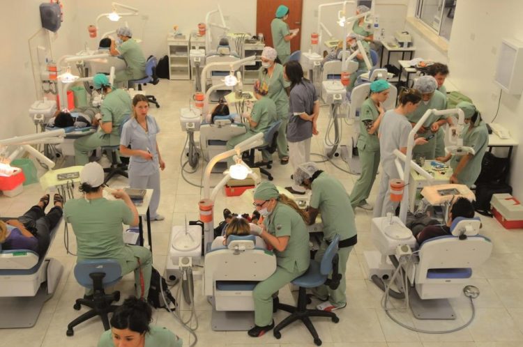 Las clínicas de atención odontológica (foto de abajo), que distinguen a la formación de la unidad académica, se presentan como una instancia en la que el trabajo grupal es obligatorio: “En las materias, insistimos mucho con lo grupal, en que se acostumbren a dialogar con sus compañeros, a consultar, porque después en las clínicas se abordan los pacientes en equipos de tres integrantes”, destacó.