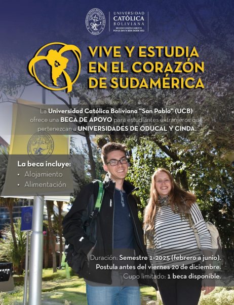 La Unidad de Relaciones Internacionales de la UCALP invita a participar de esta convocatoria de la Universidad Católica Boliviana “San Pablo” en la que ofrece a los estudiantes de la UCALP la oportunidad de postular a una Beca de Apoyo para el primer semestre de 2025, que abarca el período de febrero a junio.