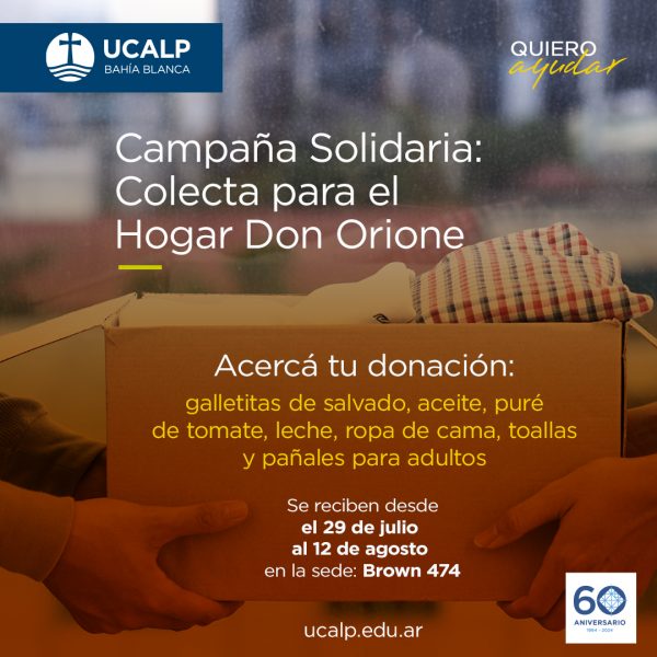 Las donaciones, que serán entregadas en el Hogar Don Orione, se reciben desde el día 29 de julio al 12 de agosto en la sede UCALP Bahía Blanca, Brown 474.