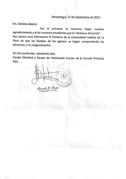 Las muestras de agradecimiento por las donaciones entregadas son siempre el motor del programa. Tal es el caso de nuestra egresada de la carrera de Abogacía de la Subsede Bernal Daniela Eugenia Adamo, quien recibió una nota muy sentida por parte del equipo directivo y de orientación escolar de la Escuela Primaria n.°33 de la provincia de Buenos Aires.