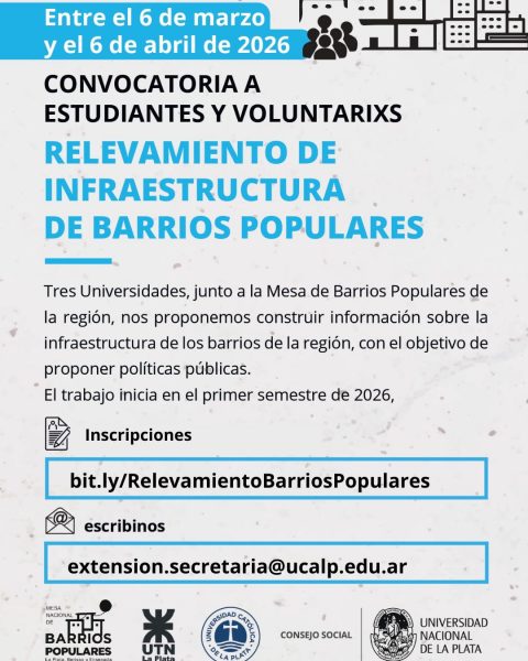 A partir de una propuesta de la Mesa Nacional de Barrios Populares (La Plata, Berisso y Ensenada), la Universidad Nacional de La Plata (UNLP), la Universidad Tecnológica Nacional (UTN-Regional La Plata) y nuestra Universidad realizarán, entre abril y mayo, un Relevamiento de la Infraestructura Pública de los Barrios Populares de La Plata, mediante la observación directa y el barrido de estos espacios, con la asistencia de una web app que permitirá cargar la información recolectada.
