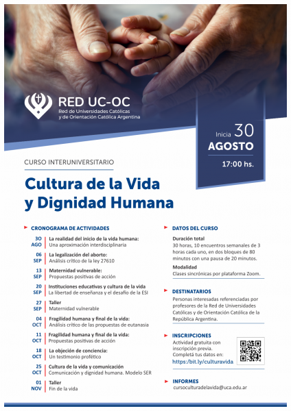 El curso se propone ofrecer una introducción a algunas problemáticas de actualidad vinculadas con la vida humana y su dignidad, particularmente en su inicio y fin, en el contexto de la reciente legalización del aborto y la existencia de propuestas para legitimar la eutanasia. Desde su identidad católica, las universidades convocantes pretenden favorecer la reflexión crítica sobre estas cuestiones, procurando, a su vez, brindar propuestas alternativas para la edificación de una cultura de la vida.