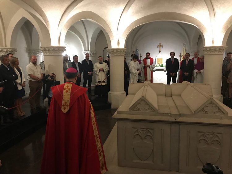Finalizado el tedeum, Mons. Fernández, en conjunto con el intendente Garro, se dirigieron a la cripta que se encuentra debajo del templo y en la cual yacen los restos del fundador de la ciudad, Arq. Dardo Rocha y su esposa, Juana Paula Arana Merino. Allí, el arzobispo bendijo su tumba, donde la máxima autoridad del Municipio depositó una ofrenda floral.