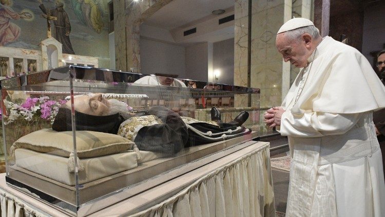 El pasado 17 de marzo en ocasión del Centenario de las apariciones de los estigmas de San Pío de Pietrelcina y en el 50.° aniversario de su muerte, el Papa Francisco realizó una visita pastoral a Pietrelcina, en la diócesis de Benevento, región de Campania, y a San Giovanni Rotondo. En el Santuario Santa María de las Gracias, el Papa veneró el cuerpo de San Pío y el crucifijo de los estigmas, se encontró con los sacerdotes enfermos y visitó la habitación del Santo.