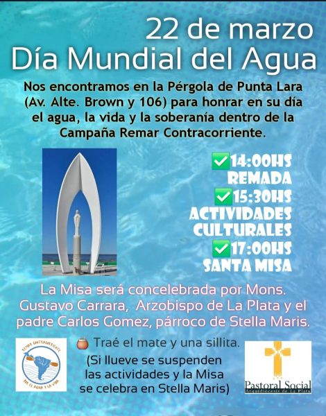 En el marco del Día Mundial del Agua, el próximo domingo 22 de marzo se realizará un encuentro comunitario en la Pérgola de Punta Lara, ubicada en avenida Almirante Brown y 106, como parte de la Campaña Remar Contracorriente. La iniciativa es impulsada por la Pastoral Social Ambiental de La Plata junto a diversos movimientos sociales.