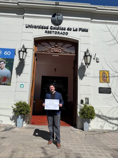 “Comencé en la UNLP, institución a la cuál le agradezco especialmente la calidad educativa en el primer año de la carrera, pero en un momento sentí como católico que quería contribuir a la intelectualidad cristiana desde adentro. Fue entonces que decidí continuar en la UCALP, ‘Nacida del corazón de la Iglesia’ (Ex Corde Ecclesiae). Luego entendí que la mejor contribución de mi parte pasaba por formarme y, llegado al momento, ser profesor. Cursé la Licenciatura a distancia y la experiencia fue muy enriquecedora“.