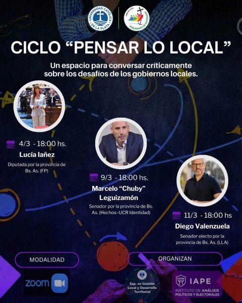 Para reflexionar sobre los nuevos desafíos en la administración de los gobiernos municipales y provinciales en la Argentina, los referentes de la Especialización en Gestión Local y Desarrollo Territorial, junto al Instituto de Análisis Políticos y Electorales (IAPE) de la UCALP, organizan el ciclo de charlas “Pensar lo local”, protagonizadas por diputados y senadores de la provincia de Buenos Aires. Estas exposiciones se realizarán en la modalidad virtual -vía Zoom- y comenzarán el próximo miércoles 4 de marzo a las 18.