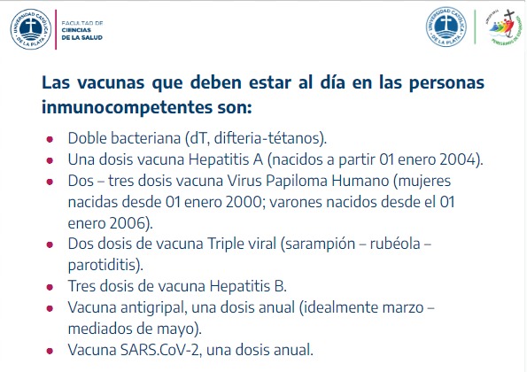 La facultad de Ciencias de la Salud de la UCALP recomienda a sus alumnos tener actualizado el calendario de vacunación, enfatizando en las siguientes vacunas: