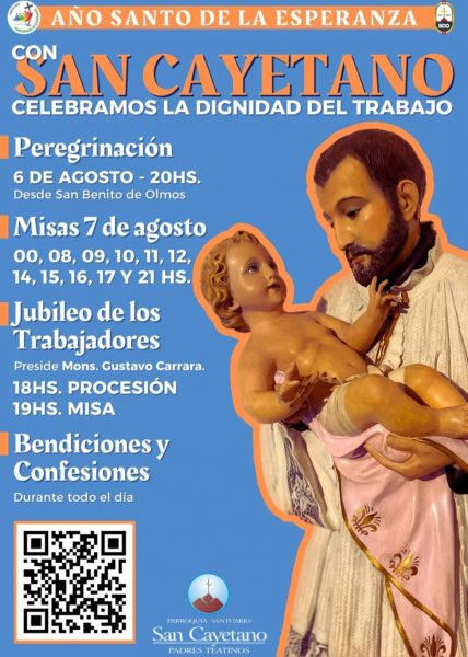 El arzobispo de La Plata, Mons. Gustavo Carrara, invita a participar del Jubileo de los Trabajadores el próximo jueves 7 de agosto, en memoria de San Cayetano de Thiene, Patrono del pan y del trabajo. La convocatoria es a las 18 h en el Santuario y Parroquia San Cayetano de La Plata, a cargo de los Padres Teatinos (avenida 44 entre 29 y 30).