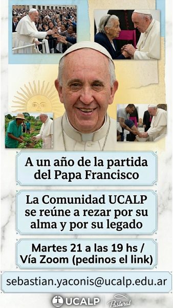 En un clima de reflexión y gratitud, la Universidad Católica de La Plata (UCALP) invita a toda su comunidad académica, administrativa y estudiantil a participar de un encuentro especial de oración, para conmemorar el primer aniversario del fallecimiento del Papa Francisco.