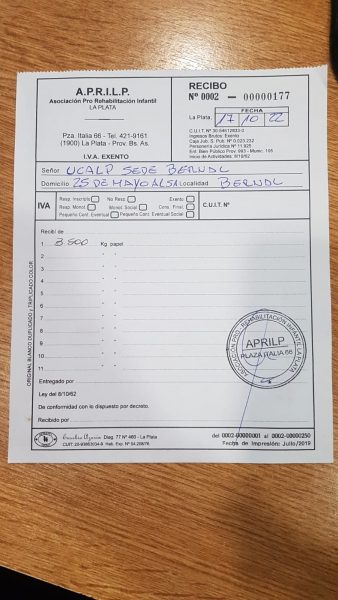 Las Autoridades de la Universidad Católica de La Plata, a través de la Subsede Bernal y la Dirección de la Biblioteca Central realizaron una donación de 3.500 kg de papel en desuso a la ONG Aprilp. Una asociación dedicada a la atención y rehabilitación de las personas con discapacidad neurolocomotora.