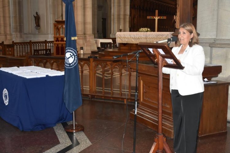 La decana de la facultad, Dra. Karina Hernández expresó que “hoy pueden mirar hacia atrás con orgullo a su proyecto de vida. Este título es fruto de su esfuerzo, su disciplina, constancia y coraje. Para quienes acompañamos su formación es un motivo de enorme satisfacción verlos crecer, no solo como profesionales, sino como personas íntegras, sensibles, comprometidas con la verdad, el bien común y el cuidado del otro. Ese es el verdadero corazón de las ciencias de la salud. A partir de ahora comienza una nueva etapa. Les tocará ejercer su profesión en un mundo complejo, muchas veces individualista, acelerado y reduccionista, donde el valor de la persona corre el riesgo de quedar opacado por la lógica de la eficiencia o del éxito inmediato. Les pedimos que no se olviden quiénes son y de dónde vienen“.