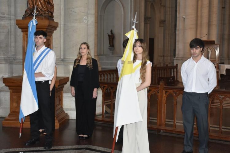 Las banderas de ceremonia fueron portadas por estudiantes distinguidos por sus promedios. La Bandera Nacional Argentina estuvo representada por Facundo Adrián Brescia, acompañado por Juana Cardarelli como primera escolta y Jazmín Ailén Romagnoli Gentile como segunda escolta. La Bandera Papal fue portada por Delfina Aylén Maranzano, acompañada por Nahuel Otondo y por Federico Ezequiel Gómez como escoltas.