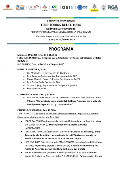 La Red Universitaria para el Cuidado de la Casa Común (RUC), de la que forma parte la UCALP, inauguró el Encuentro Internacional Territorios del Futuro, Atlántico Sur y Antártida, que se desarrolla en la Casa de la Cultura Ángela Loíj de Río Grande, Tierra del Fuego. El evento de vital importancia para el cuidado ambiental y climático reúne a expertos de varios países, rectores de diversas universidades nacionales, públicas, privadas, católicas y confesionales.