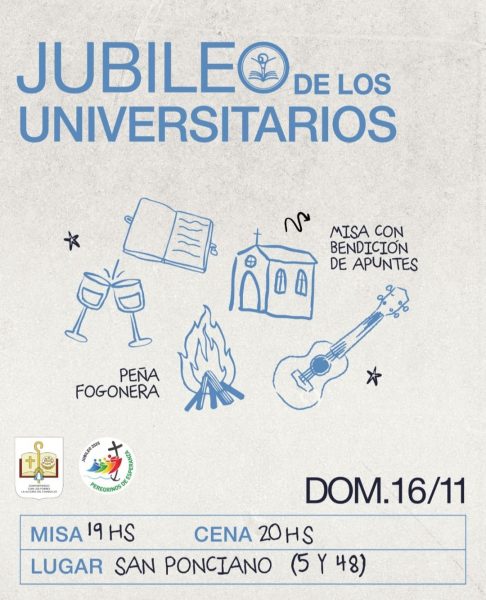 Para los universitarios, este jubileo servirá para compartir y renovar su fe, con una misa de apertura, seguida de música en vivo, cena, baile y juegos. Además, se realizará una bendición de los apuntes académicos, para cargar de energía positiva el cierre del Ciclo Lectivo.