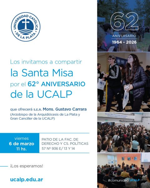 El Arzobispo de La Plata y Gran Canciller de la UCALP, monseñor Gustavo Carrara, celebrará una misa para conmemorar el 62.º aniversario de nuestra casa de altos estudios, el próximo viernes 6 de marzo a las 11 en el hall de la Facultad de Derecho y Ciencias Políticas. Junto a él, estará el Pbro. Gonzalo Huarte, quien concelebrará la ceremonia.