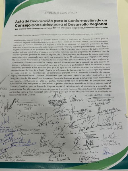 Durante la reunión, no solo se firmó un documento de compromiso para sumar a los proyectos que elabora el Consejo a los cinco municipios que forman parte de la región, como Ensenada, Berisso, Magdalena, Brandsen y Punta Indio, sino que además expuso el secretario de Planeamiento, Obras y Servicios Públicos de la Municipalidad de La Plata, el arquitecto Sergio Resa.