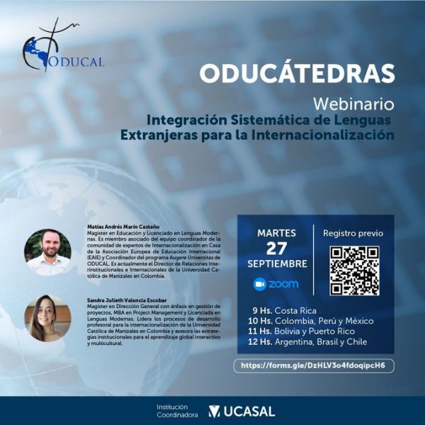 La Unidad de Relaciones Internacionales de la UCALP invita a participar el martes 27 de septiembre del webinario (12 h de Argentina) del Programa ODUCÁTEDRAS de la ODUCAL a través de la plataforma ZOOM.