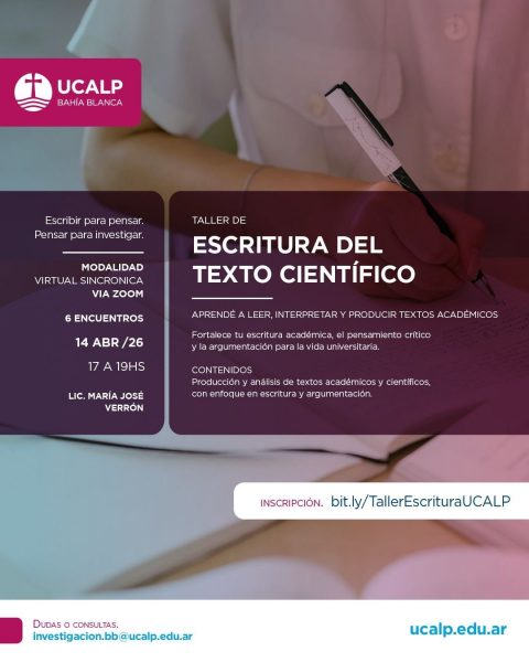 La inscripción al taller podrá realizarse a través de bit.ly/TallerEscrituraUCALP y las consultas se recibirán en investigacion.bb@ucalp.edu.ar